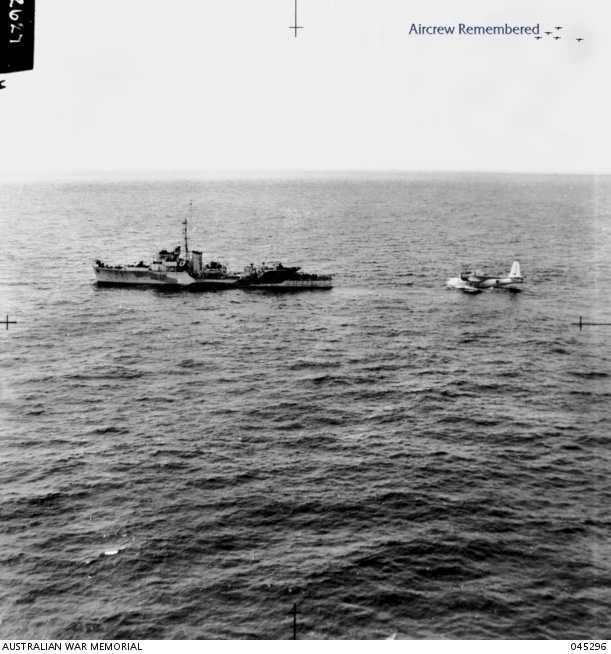 | 2 | Singleton | Gordon O. | P/O | 400841 | St. Kilda Victoria Australia | Australia | Pilot/ Captain | RAAF | Coastal Command | 461Sqn RAAF![]() | 1943-05-29 | Sunderland | ll | T9114 | E | Pembroke Dock | Air Sea Rescue | Damaged on take off | Survived | ![]() Autobiography | CREW: Co-Pilot 415195 Flight Sergeant Pearce E. Taplin of Midland Junction,WA; Navigator 401356 PO Harry Winstanley DFC of Geelong, Vic; Engineer 9429 Sergeant (Sgt) H. Hall of Moonee Ponds, Vic; Wireless operator-mechanic Flt/Sgt Ronald (Hughie) Church, RAF; Wireless operator-gunner 405228 Sgt Johnny Lewis of Brisbane, Qld; Airgunner 407210 Flight Officer George Viner of Adelaide, SA. Short Sunderland T-9114, Aircraft 'E' for Emu of 461 Squadron, Coastal Command sustained a large hole in the hull plates in the region of the toilet when taking off in a lumpy sea 150 nautical miles beyond Bishop Rock, after rescuing crews of two other Coastal Command aircraft. One of these was a Whitley and the other was Sunderland 'O' of 461 Squadron RAAF which had crashed while attempting to land to rescue the Whitley crew. Sunderland 'E' landed in the open sea at 7.00 hours (Double British Summer Time) at a spot 175 nautical miles southwest of Bishop Rock and picked up the two crews from dinghies. As the sea was too rough for a take off the Sunderland began taxiing towards England and at about 10.00 hours was met by the Free French destroyer La Combattante. The destroyer took 21 persons including five of the Sunderland 'E' crew on board and sent an armourer to disarm the aircraft's depth charges which were then jettisoned. At 13.00 hours the destroyer took the Sunderland in tow but many difficulties were met. Finally at 15.00 hours the towline broke and at 18.00 hours preparations were completed for take off. This had to be commenced across wind because of the state of the sea and took three or four times as long as usual. It was finally achieved after turning head-on to the wind and striking large waves, the last one of which hurled the Sunderland into the air but also ripped a large hole in the hull. This ruled out any possibility of a sea landing. At 20.00 hours Sunderland 'E' was near the entrance to Milford Haven and its skeleton crew spent the next half hour throwing overboard flares and loose heavy items in preparation for a crash landing. These preparations proved unnecessary when a gentle landing was made at 20.40 hours on the grassy Angle airfield. Half of 461 Squadron was at Angle airfield to see the landing and the unorthodox disembarkation of the crew. The motley uniforms worn by the crew were what were left after wet survivors of the two rescued crews had been given an open go at the clothing originally worn and carried by the crew of 'E'. The destroyers delivered all of its passengers safely including a pilot of Sunderland 'O' of 461 Squadron RAAF who had been very badly injured. Apart from him all the others were able to continue with their duties as soon as aircraft could be found for them. Sunderland 'E' for Emu never flew or floated again." (Commentary written by Harry Winstanley, DFC) ![]() UNDER TOW BY THE FRENCH DESTROYER 'LA COMBATTANTE'. | Paul McGuiness RAAF Archive |