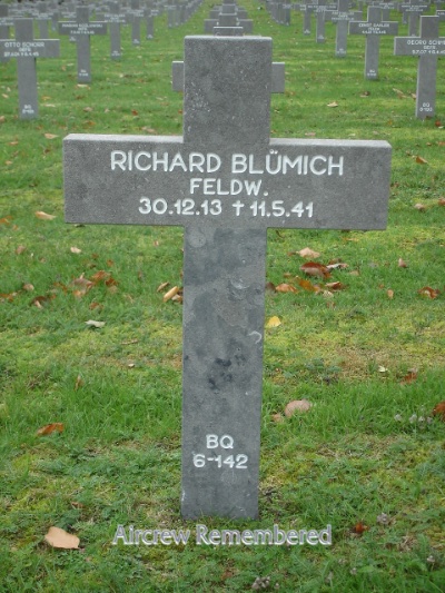 | 79 | Blümich, Richard | Fw | 12/30/1913 | 7/KG-55 (5/41 Melun-Villaroche) | He 111P-2 Werk # 1409 "G1 + KR" (lost 5/11/41) | ![]() EK 2 ![]() Bomber Clasp Bronze | His He 111 crashed at the Het Canal (English Channel) on 11 May, 1941, cause and pilot/crew disposition unknown. (DeSwart). Added: Remaining crew: Fw Edmund Mehlber, Obs (KilledInAction (KIA)); Uffz Wilhelm Ahrens, R/O (KilledInAction (KIA)); Gefr H. von der Heyden, Flt Engr (MIA) and Gefr J.Moritz, Gnr (MIA). The thredeceased are buried in Ysselsteyn: Blümich, Blk BQ, Row 6, Gr 142; Mehlber, Blk AR, Row 8, Gr 181 and Ahrens, Blk AR, Row 8, Gr 182 (D.Drury). |