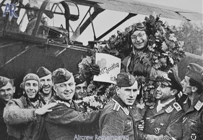 | 65 | Boenke, August-Wilhelm "der fliegende Auwi" | Hptm | 1914/07/09 | Massow, Kreis Naugard (West Pomerania) | Stfkpt 3.(H)/Aufkl.Gr. 21 (09/41-09/42), Lw.-Führungsstab Ic (03/43). Stfkpt 2./NAGr. 4 (1944) | Hs-126, Bf-109 (lost 16/10/44) | EK 1 & EK 2 ![]() Recce Operational Clasp in Gold Hungarian Knights Cross with sword and war ribbon Medaglia di bronzo al valor militare (Italy) | KIA when shot down on 16 October 1944, the day of the start of the Sowjet "Gumbinnen-Goldaper" operation, by Jak-9 fighters. An emergency landing was not possibly anymore. He flew the 1000th combat mission of the Staffel in 10/41 (see pic) and is seen on another picture in October 1944 with Lt Karl-Heinz Wilke at the 4000th mission of the Staffel, probably the last picture from him. What is really interesting are his glasses which with he flew (attached with a rubber strap, he even flew Stuka missions according to confirmed documents) - this was a rare exception for flying personnel!