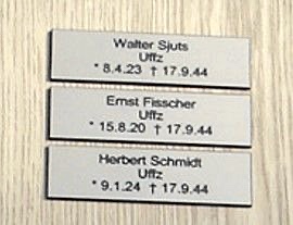 | 32 | Sjuts, Walter | Uffz | 4/8/1923 | Duisburg | 11/NJG-1 (9/44 Dortmund) | Bf 110G-4 Werk # 740358 [140358 per Find-A-Grave & SGLO] "G9 + MY" (lost 9/18/44) | Night Fighter Operational Clasp | His G-4 crashed at Landhorst Holland (gem. Wanroij) the night of 17/18 September, 1944, cause and pilot/crew disposition unknown (DeSwart). Added: Crash location reported as St Anthonis, Netherlands. Shot down by a Mosquito XIX of No.85 Sq., piloted by F/O Alan J.Owen. Uffz Sjuts was killed, and he is buried at Ysselsteyn AA-10-244. Remaining crew (also buried Ysselsteyn as "ein Deutscher Soldat", nearby Uffz Sjuts): Mech Ernst Fischer geb 8/15/1920 Wurzbach), AA-10-243 and R/O Herbert Schmidt (geb 2/2/25 Thüringen, see picture), common grave w/Uffz Sjuts, AA-10-244. (Find-A-Grave by Fred). Note: 740358 seems to be a better match for G-4's in NJG-1. | ![]() ![]() ![]() ![]() ![]()