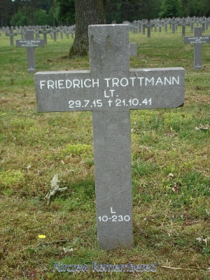 | 23 | Trottmann, Friedrich | Oblt (postmortem) | 7/29/1915 | 4/KG 40 (10/41 Soesterberg) | Do 217E-2 Werk # 0114 (lost 10/21/41) | His Do 217 crashed at Mheer Holland, east of Eijsden, on 21 October, 1941, cause and pilot/crew disposition unknown (DeSwart). Added: The entire crew were KilledInAction (KIA) when their ac crashed in the vicinity of Mheer, 10km SE of Maastricht, due to fuel starvation. Remaining crew (all bur Ysselsteyn): Uffz Karl Fischer (geb 12/6/1915, bur L-10-231), Obs; Uffz Winfried Kleinat (geb 4/29/1921, bur L-10-232), R/O and OGefr Adolf Hofmann (geb 17/06/1922 Bayerbach., bur L-10-233), Gnr. Pilot Oblt Trottmann buried L-10-230 (Find-A-Grave by Fred & LOCS). |
