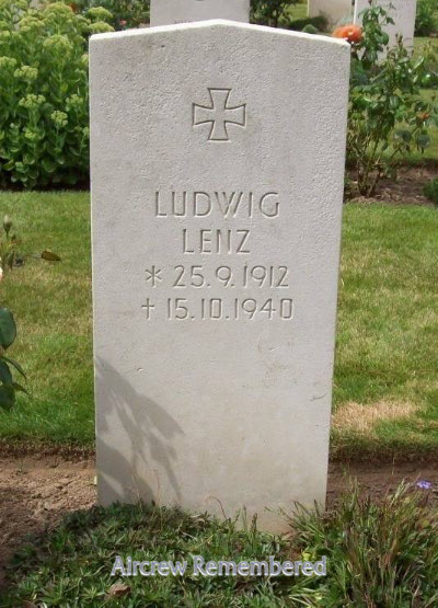| 41 | Lenz, Ludwig | Lt | 9/25/1912 | Böblingen | 3 | Stab I(J)/LG-2 (Channel) | Bf 109E-7 Werk # Unk "Yellow 3", Bf 109E-7 Werk # 3734 "<+" (lost 10/15/40) | EK 1 & 2 Fighter Operational Clasp | KilledInAction (KIA) 15 October, 1940; while flying a Fighter bomber mission, a single Spitfires bullet hit the bomb slung underneath and exploded, spreading the wreckage over a 3 mile area, at Spruce Lawn(s), Elham, Kent. Added: Lt Lenz, still strapped in the main body of the fuselage, fluttered down to earth at Older's Bank, on Older's Poultry Farm. Found in the wreckage, and barely alive, he was carefully lifted out, but succumbed to his wounds later that afternoon (C.König). Buried Hawkinge Cem., Kent, German Plot "O", Row 2 Gr 2 (M.Croft). One reported victory found on 12 Oclock High Forum Board, a Hurricane over England on 10 July, 1940. Item questioned this being the first Battle of Britain victory. His 2nd, a Spitfire in the area of the Isle of Wight on 18 August, 1940. His 3rd, a Spitfire in the Dover area on 24 August, 1940.