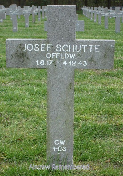 | 50 | Schütte, Josef "Jupp" | FhjOfw | 8/1/1917 | 41 | 4/JG-3 (5/42 S.U.), 5/JG-3 (12/42; 7/43 S.U.), 3/JG-3 (8/43), 5/JG-3 11/JG-3 (12/43 Volkel) | Bf 109F, Bf 109G-4 Werk # 19976 "Black 7 + -" (7/5/43; WIA at Woltschansk), Bf 109G-5 Werk # 15955 "Black 8 + -" (lost 12/4/43 DeSwart) | ![]() Deutsches Kreuz - Gold(11/25/43) EP EK 1 & 2 Wound Badge(7/5/43) Fighter Operational Clasp | KilledInAction (KIA) 4 December, 1943 during aerial combat with a P-47 in his G-5, crashing at Achterveld, 7 km west of Barneveld Holland (DeSwart). Buried Ysselsteyn CW/1/23 (Ton van Bon). WIA 5 July, 1943 during aerial combat with a Boston. One known victory, His first known Soviet victoy, an I-153, no location and an I-61 12 km E of Volokhov Yar on 26 May, 1942. Another Soviet, a MiG-1 NW of Kansenka on 22 June, 1942. A Soviet double victory on 24 June, 1942; an R-5 and an R-10. An Il-2 on 13 July, 1942. A Yak-4 1 km N of Kalatsch on 10 September, 1942. An Il-2 N of Stalingrad on 28 September, 1942. A LaGG-3 on 3 December, 1942. A MiG-1 on 20 December, 1942. A Yak-1 8 km SE of Pitomnik on 22 December, 1942. An Il-2 on 30 December, 1942. A Yak-1 5 km S of Bhnf. Kotluban on 7 January, 1943. A Pe-2 15 km W of Pitomnik on 12 January, 1943. His 25th a MiG-1 on 2 March, 1943. An Il-2 on 10 March, 1943. An A-20 Boston on 19 March, 1943. A Hurricane on 20 March, 1943. A LaGG-3 and an I-180 on 6 May, 1943. An Il-2 on 12 May, 1943. A LaGG-5 and a Yak-1 on 8 June, 1943. His 41st, a B-17 (e.V.) W of Venlo on 12 August, 1943.