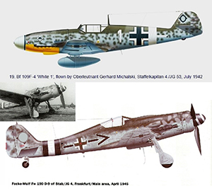 | 24 | Michalski, Gerhard | Obstlt | 1917/06/27 | Augsdorf, Südharz | 73 | 6./53 (39), 4./JG 53 (03/42), Stfkpt in 4./JG 53, Kdr II./JG 53 (10/42-43), Stabstf I./JG 11(07/44), Kdr JG 4 (08/44-04/45) | Bf 109 F-2 "Black <1 + -" (04/41), Bf 109F-4/Trop "White 1 + -" (07/42), Bf 109 G-2 Werknr 10484 (lost 15/10/42; combat off Marsa-Scirocco, bailed safely, rescued OK), Bf 109 G-6 Werknr "<< + -" 16362 (lost 18/06/43 in JG 53), Bf 109 G-6 Werknr 440232 in JG 4, Fw 190 D-9 "< - + -" in JG 4 (04/45 Neukirchen Ger.) | ![]() RK (04/09/42) EL (No 667 25/11/44 CK) ![]() Spanish Cross ![]() EK 1 (09/39 CK) & EK 2 Wound Badge (06/43 CK) ![]() Fighter Operational Clasp in Gold with pendant Medalla de la Campaña de España 1936-1939 (CK) | His 1st victory was a Morane southwest of Saargemund, 31 October, 1939. His 2nd, a Hurricane SW of Portland on 15 August, 1940. His 3rd, a Spitfire at Folkestone on 10 October, 1940. His 4th, a Spitfire over England on 11 October, 1940. His 5th, a Hurricane 20 km S of London on 28 October, 1940. Over Malta, he was able to achieve 26 victories. He was shot down six times. Once, he spent several hours in a rubber dingy in the Med.. Shot down 15 October, 1942 by Spitfires off Marsalokk Bay in G-2 #10484, landing in the sea and rescued by a Do 24 ASR seaplane. Shot down 18 June, 1943 by a Spitfire near Donnafucata Sicily in G-6 #16362. Bailed with wounds, rescued again by ASR, his 500th mission. Shot down with wounds 1 May, 1944 in G-6 #440232. On 22 February, 1946, he was killed in an auto accident. Died in a hospital in Kaltenkirchen. 652 combat missions. 13 bombers. His 67th, a B-17 at Königsdorf on 13 April, 1944. A Lancaster NW of Nijmegen on 21 September, 1944. A Typhoon SW of Goch on 27 September, 1944. His 73rd and last victory, a Yak-9 on 8 March, 1945. 14 victories in the East.