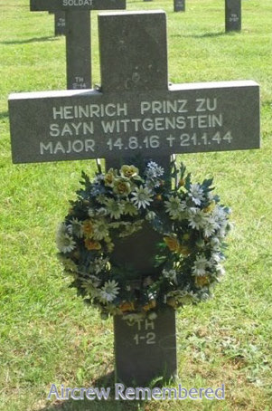 | 96 | Sayn-Wittgenstein, Heinrich Prinz zu | Maj | 8/14/1916 | Kopenhagen Denmark | 83 | KG-51 (5/40), KG-1 (6/41), Kdr IV/NJG-5 (12/42), NJG-100, II/NJG-3, Kdr NJG-4, Kdr NJG-2 (1/44 Deelen) | He 111(KG-51), Do 17Z(NJG-2), Ju 88C(NJG-3), Bf 110(NJG-5), Ju 88C-6 #750467 "R4 + XM"(lost 1/22/44) | RK(10/2/42)-EL(8/31/43)-S(1/23/44)![]() Deutsches Kreuz - Gold(9/7/42) EP(5/19/41) EK 1 & 2 NJ Oper.Clasp w/"300" | KilledInAction (KIA) the night of 21-22 January, 1944 in Ju 88C-6, when he was Kdr NJG-2; sd by a Mosquito of No.141 Sq., piloted by P/O Desmon B.Snape during a raid on Magdeburg, after downing five enemy AC himself. 150 missions against ground targets while in KG-1 & KG-51 in Russia. 29 night victories in Russia. One known victory, a Lancaster B, Mk 1, "R5632"; crashed into the North Sea, 19 mi. W of Den Haag, 24 July, 1942 (R.Snape). Three DB-3s and a Boston the night of 19-20 July, 1943. His first known Soviet night victory, two DB-3s on 17 April, 1943. A DB-3 on 23 April, 1943. Another Soviet, a B-25 SE of Schweindl (sic) on the night of 23-24 April, 1943. A Soviet DB-3 the night of 11-12 July, 1943. Seven Soviet victories on the night of 20-21 July, 1943. His 1st known western victory came on 9 May, 1942, four months after joining NJG-2. His stay in the west was brief, and he returned to Russia in May 1943 downing a DB-3 SE of Eydklau on 1 May, 1943. He was Kdr JG-100 in August, 1943. Numerous multiple victory nights including 5 AC on 21/22 January, 1944, the night he perished. His R/O in IV/NJG-5 (June 1943) was Herbert Kümmritz. In II/NJG-3 & NJG-2, it was Fw Friedrich Ostheimer ("Tame Boar" radar oper; survived) and Mech. Kurt Matzuleit, both safe the night of 21/22 January. Maj Sayn-Wittgenstein's body was found in a woods near Stendal. Buried at the German War Cemetery at Ysselsteyn, Holland, TH-1-2. | ![]()