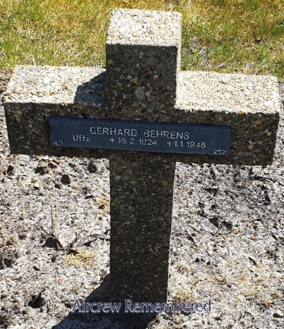 | 20 | Aubertin, Friedrich | Uffz | 8/22/1922 | Riegelsberg | FFS B-22 | He 111H-11 Werk # 8390 (lost 5/29/44) | Student Pilot? | KilledInAction (KIA) with all onboard during a training flight on 29 May, 1944; sd by a fighter and crashed near Ybbs a.d. Donau, Lower Austria. Remaining crew: Gefr Richard Ott, R/O; Uffz Friedrich Hoheisel, Flt Engr; Gefr Gerhard Klinkowitz, Gnr and Gefr Paul Hahn (or Hohn), Student. Uffz Aubertin is buried in the War Cem at Riegelsberg, Germany, Row 2, Grave 30 (D.Drury). | ||||
