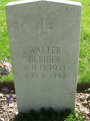 | 83 | Bleiber, Walter | Gefr | 1921/12/11 | Albersdorf, Bavaria | 3./Kü.Fl.Gr 106 | Ju-88 | Sole crew member (Gunr?) washed ashore after being KIA on 19 August 1942 when crashed into the sea 4 miles off Selsey Bill, having been shot down by a Beaufighter of 141 Squadron, crewed by Sergeant Clee and Sergeant Grant. Of the unknown German crew, the body of Bleiber was washed ashore at Rottingdean on Saturday the 5 September 1942. He was buried with full military honours in the Bear Road Cemetery, Brighton, Sussex. Block ZGP Grave 7 |