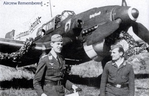 | 95 | Bergmann, Gerhard | Lt | 3/11/1924 | Memel | StG-101 (6/43), Flzfüh 3/SG-1 (10/44 S.U.) | Ju 87B, Fw 190F-8 & F-9, Me 262 (Berlin 4/45) | ![]() Deutsches Kreuz - Gold EP (9/1/44) EK 1 (5/2/44) & EK 2 (3/2/44)Wound Badge Dive Bomber/Assault Operational Clasp | A Former HJ, he entered the Luftwaffe on 15 October, 1942 and recd his pilot certificate on 2 June, 1943. 248 combat missions; shot down twice by flak. Destroyed 21 Soviet tanks, 2 munition trains and five British transport ships (2 off Malta), 8 bridges and numerous artillery & flak guns. Served in all theaters. He was also qualified to fly the Me 109 and Me 110. His Gunner named Hubert Keuter. Source: His personal photo album on sale online. | ![]() | |||