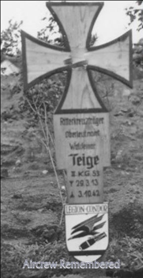 | 96 | Teige, Waldemar | Oblt | 3/29/1913 | Striese Schlesien | 11 | 5/KG-53 (1/41 Lille), 6/KG-53 (1/42), 8 & 5(Nacht)/KG-53 | He 111H-6 Werk # 4505 "A1 + GN" (dam 3/17/42), He 111H-6 Werk # 7410 "A1 + AC" (lost 10/3/42) | RK(6/7/42)![]() Deutsches Kreuz - Gold(8/21/42) EP(4/1/42) EK 1 & 2 Bomber & Night Fighter Operational Clasp w/Pendant | KilledInAction (KIA) 3 October, 1942, his He 111 shot down by Russian flak at Mesnik, near Leningrad. His crew bailed safely (Fw Willi Rieck & Fw Xaver Glonner), but Teiges parachute hung up on the tail and he was killed when the ac crashed. 300 combat missions; 2 Day and 9 Night victories. He was known as the originator of the Night Fighter element of II/KG-53, using the He 111. He received the RK for his 9 Night victories, and two days later, he downed two Soviet U-2s of 662 NBAP. He was the first RK recipient in II/KG-53. Oblt Teige was buried in the War Cem. at Sebesh, Russia, Blk 14, Row 11, Gr 1486 (burial source D.Drury). Added: Teige claimed 12 night kills - see picture of his He-111 (CKönig)