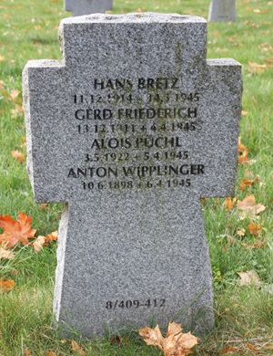 | 48 | Amersberger, Jakob | Uffz | 30/11/12 | Trostberg an der Alz (CK) | I/KG-30 (6/41 Eindhoven) (Added: 1./KG 30 CK) | Ju 88A-5 Werk # 5961 "4D + ??" (lost 6/23/41) | Bomber Operational Clasp | His Ju 88 crashed at Steensel Holland, SW of Eindhoven, on 23 June, 1941, cause and pilot/crew disposition unknown (DeSwart). Added: Crashed after takeoff, cause not reported but no enemy action (CK). The entire crew were KIC, and buried at Ysselsteyn. Pilot Uffz Amersberger buried AA-1-25. Remaining crew: Fw Wilhelm Linka, Obs (01/05/14 in Poland, bur Z-2-50); Ogefr Hans Karkuschke, R/O (24/05/18, bur Z-2-49) and Ogefr Götz Max Schrödter, Gnr (12/02/16 in Calbe, bur Z-2-48) (SGLO). Alternate spelling: Armersberger per VDK. Added: Amersberger in official obituary (CK) |