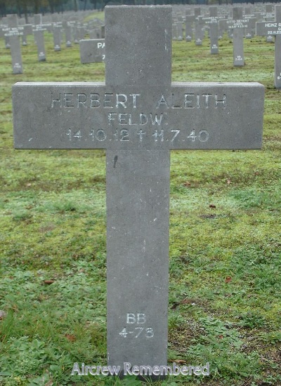 | 14 | Aleith, Herbert | Fw | 10/14/1912 | 2/KG-55 (7/40 Villacoublay) | He 111P Werk # Unk (lost 7/11/40) | Bomber Operational Clasp | KilledInAction (KIA) 11 July, 1940; failed to return from a mission over England, crashed into the Channel. His body washed ashore 26 October, 1940 near Wissenkerke Holland. Buried first at Vlissingen, then at Ysselsteyn BB-4-78. Remaining crew (MIA): Obs K.Maiereder; R/O W.Ruschewitz; Engr P.Klein and Gnr A.Reindl. Source: Find-A-Grave by Fred. |