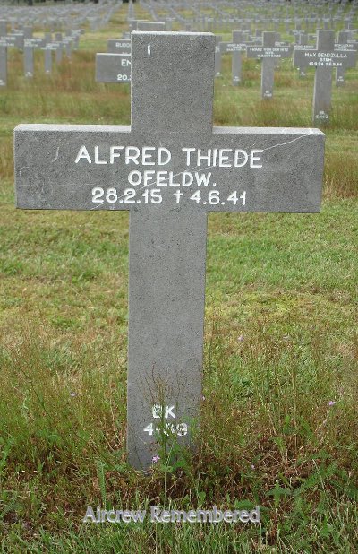 | 18 | Thiede, Alfred | Ofw | 2/28/1915 | 3/KG-27 (6/41) | He 111H-5 Werk # 4027 "1G + FL" (lost 6/6/41) | Bomber Operational Clasp | KilledInAction (KIA) with unnamed crew the night of 5/6 June, 1941; sd over West Runton by a Beaufighter of No. 25 Sq., piloted by Sgt K.B. Hollowell. Source: J.Schadskaje. Added: While Sgt Hollowell did down an He 111 this night, it was not Ofw Thiede. The Thiede ac was sd by a Beaufighter of No. 604 Sq., piloted by F/O Keith I.Geddes. The ac crashed into the sea off Ventnor, Isle of Wight. Thiede buried at Ysselsteyn, BK/4/89. Remaining crew (MIA): Oblt Albrecht Wallenstein, Obs; Ofw Rudolf Engel, R/O and Ogefr Erwin Fehlau, Flt Engr (D.Drury). |