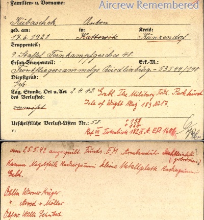 | 46 | Möller, Arved von | Oblt | 11/2/1918 | 9/(Fern)KG-40 (4/42) (Long Range Bomb Sqd.) | He 111H-6 Werk # 4311 "F8 +GT" (lost 4/3/42) | Bomber Operational Clasp | MIA the night of 2/3 April, 1942 after attacking Weymouth. The ac crashed into the sea east of Portland, sd by a Beaufighter of No.604 Sq., piloted by Flt Lt E.D.Crew & P/O Facey. Remaining crew (desig unk): Oblt Werner Krüger (geb 7/27/1913, Schivelbein), Obs(?); Ofw Willi Schubert (MIA) and Gefr Anton Kübaschek (geb 6/17/1921, Künzendorf). Oblt Krüger and Gefr Kübaschek are known to be buried in the German War Cem at Cannock Chase, Staffordshire, UK, Krüger Blk 7, Gr 218 and Kübaschek, Blk 8, Gr 21, after several temp burials. On the reverse of his Graves Registration Card, was a note, dtd 5/25/42, that also recovered was a wristwatch with broken dials, a Kanun nail file, a small metal plate and money (Simon Glancey & LOCS 10/10/25).