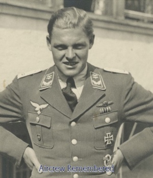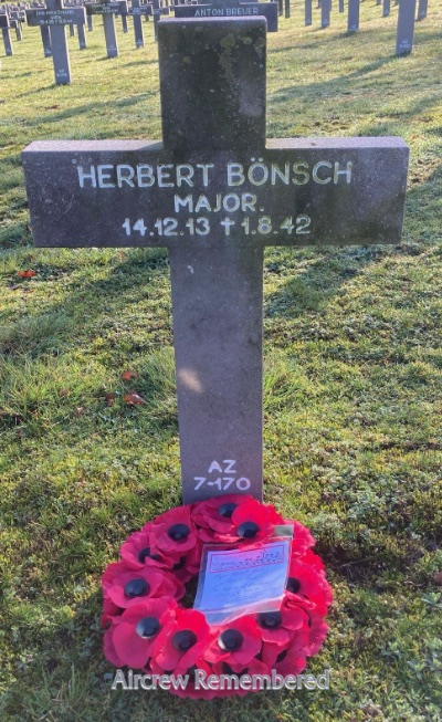 | 46 | Bönsch, Herbert | Hptm | 12/14/1913 | Dresden | 12 | Stfkpt 2(Z)/KG-30 (7/40), 1/NJG-2 (2/41 Gilze-Rijen),Kdr 9/NJG-2 (5/42; 8/42 Gilze-Rijen) | Bf 110 in KG-30, Ju 88C-2 Werk # 0239 "R4 + FH" (20% dam 2/16/41,enemy fire, crew OK), Ju 88C-2 Werk # 0744 (50% dam 5/10/42; inj emergency landing Dresden), Ju 88C-6 Werk # 360152 "R4 + AD" (lost 8/1/42) in III/NJG-2 | ![]() Deutsches Kreuz - Gold(8/4/42 Post.) EP EK 1 & 2 Wound Badge Night Fighter Operational Clasp | KilledInAction (KIA) the night of 31 July/1 August, 1942 crashing his Ju 88C-6 at 1:25 AM at Poortugaal Holland, 10 km south of Rotterdam, after taking return fire from an RAF Halifax II BB195 "MP-B" of No. 76 Sq., remaining unnamed KilledInAction (KIA) (DeSwart & Ju 88 Loss List). Buried Ysselsteyn, A2/7/170 (Rosseels). One known victory, a "Roc" by Norway, 16 April, 1940. Another, a Skua southeast of Narvik, 16 May, 1940. His 3rd, a Blenheim at Waddington on 16 Feb., 1941. His 4th, a Blenheim at Scampton, the night of 26-27 February, 1941. His 5th, another Blenheim at Scampton the night of 1-2 March, 1941. A 6th, a Wellington 120 km east of Harwich on 16-17 June, 1941. A 7th, a Wellington 115 km E of Cromer the night of 17-18 June, 1941. An 8th, a Wellington 75 km NE of Great Yarmouth the night of 22-23 June, 1941. A 9th, a Halifax II of RAF No. 76 Sq. damaged over southern Holland, making it back to the East Anglia coat, crashing at Chelmsford on the night of 31 July- 1 Aug, 1942. Added: Remaining crew KilledInAction (KIA)): Fw Otto Botcher, R/O, bur Yssel AZ/7/171 and Uffz August Willie, Gnr, bur Yssel AZ/7/169 (R.Snape). Alternate spelling: Bonsch. | ![]()