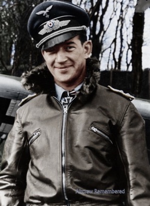 | 92 | Krakowitzer, Friedrich "Kraksel" | Lt | Austria | 25 | 7/JG-51(7/43 S.U.), Stfkpt 7/JG-51 (5/44) | Bf 109G, Fw 190A-8 Werk # 170094 "Blue 11" (lost 7/4/44) | ![]() Deutsches Kreuz - Gold EP EK 1 & 2 Fighter Operational Clasp | KilledInAction (KIA) 4 July, 1944 during aerial combat with P-47 fighters of the 404FG over Coutances (St Lo). No known grave. His first known victory, a Boston and an Il-4 on 5 July, 1943. Three Il-4s and a LaGG-3 on 6 July, 1943. A MiG-3 on 7 July, 1943. A MiG-3 on 8 July, 1943. A MiG-3 on 15 July, 1943. An Il-2 (m.H.) on 30 July, 1943. A LaGG-5 on 3 August, 1943. A Yak-7 SE of Nevel on 11 October, 1943. An Il-2 24 km E of Vitebsk on 11 November, 1943. A Yak-7 on 15 December, 1943. An Il-2 (m.H.) on 28 December, 1943. A LaGG-5 on 6 January, 1944. A Yak-7 on 24 January, 1944. A Yak-9 on 30 January, 1944. A Yak-7 on 6 February, 1944. An Il-2 on 21 February, 1944. A Yak-7 on 10 March, 1944. A Yak-7 on 5 April, 1944. A Yak-7 on 12 April, 1944. One known western victory, his 24th, a P-51 into the sea, 10 km N of Alencon on 17 June, 1944. His 25th, a Spitfire S of Caen on 30 June, 1944. Most of his victories were claimed in the East. Magnus. | ||||