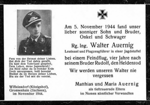 | 30 | Auernig, Walter | Lt | 4/20/1923 | Lavamünd | 3/JGr Süd, 13/JG-300 (Reinsdorf) | Bf 109G-14/AS Werk # 780675 "White 15" (lost 11/5/44 near Oberleutzendorf/Brüx) | Fighter Operational Clasp | KIC 5 November, 1944 on a non-operational flight at Chuderin CZ, by Oberleutzendorf. | ![]() ![]() | |||