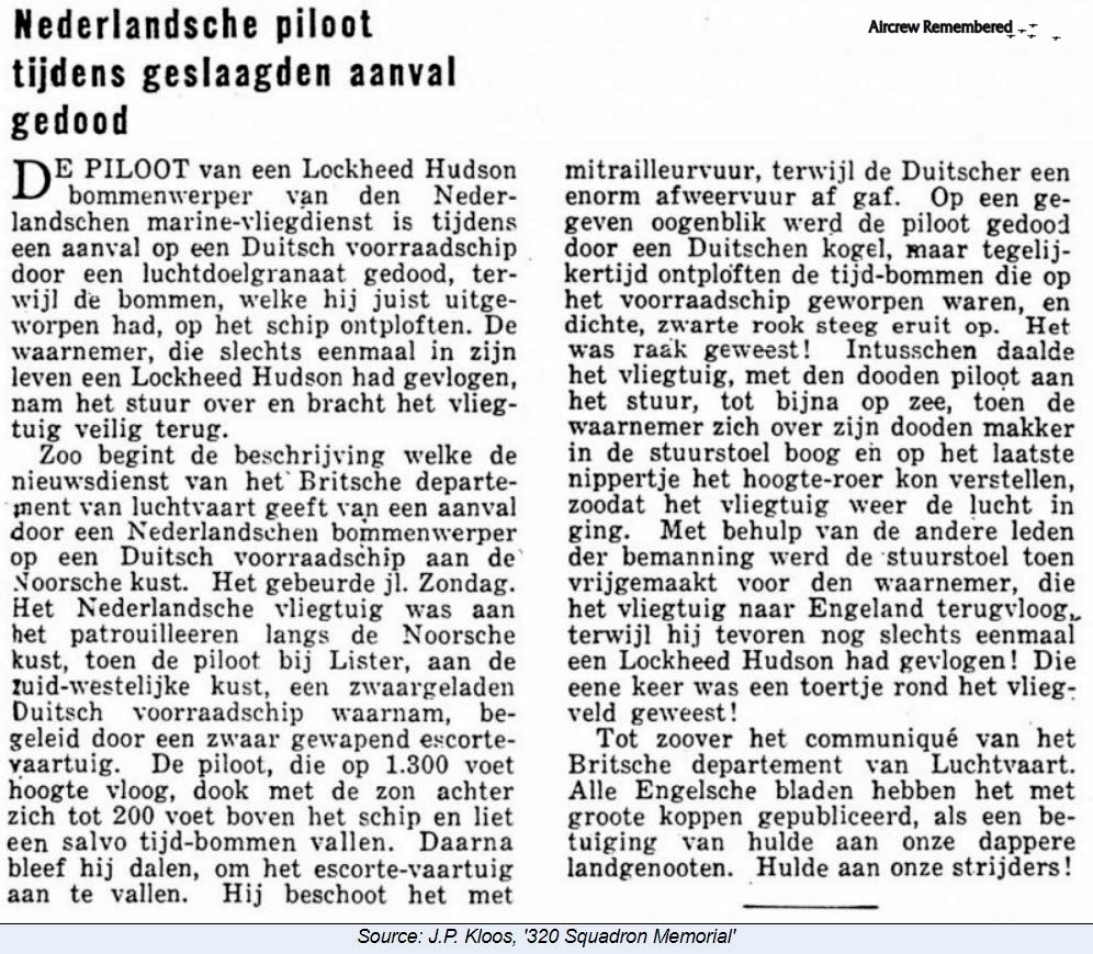 MLD-RNNAS- | Otterloo | van | Christiaan Anthony Eppe | 1941-11-23 | Vn: Christiaan Anthon Eppe (Hein) - Dec: ON.BEMx - Rang: Sgt Vl - Sqn: 320C - Vl: Hudson Mk III T9440 NO-Q 'Vliegende Hollander' - No crash. Killed in the air off the Norway coast, Lindesnes area. | All Casualties 1913-2009